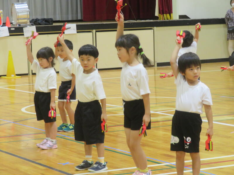 今年のかもめ組さんは鳴子に挑戦しました、音楽に合わせ鳴子を鳴らす子どもたち。