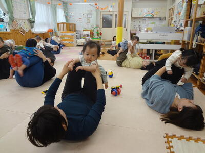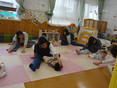 お子さんたちは、オモチャを触ったり近くの友だちが気になり、ずりばいで近寄ってご挨拶。「ママ何してるの?」とママを見ているお子さんもいましたね。