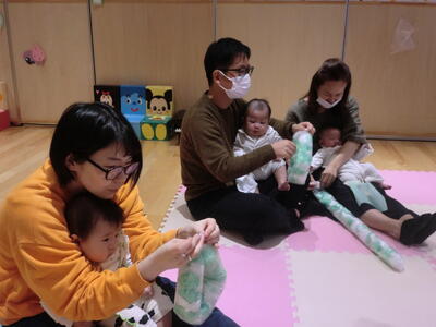 ねんね、ハイハイ、歩き初めまでのお友だちの参加で『ポットンおとし』を作りました。
