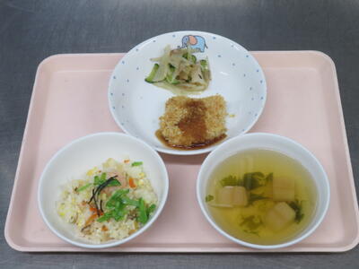 給食は、ちらし寿司 チキンカツ 梅おかか和え すまし汁。