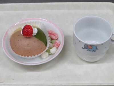 おやつは、牛乳 イチゴケーキでした。