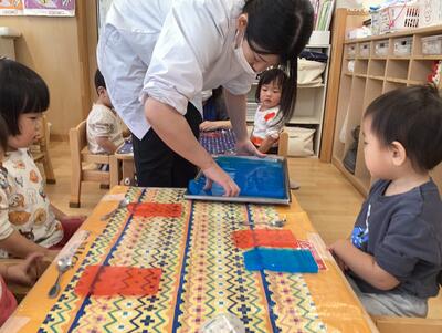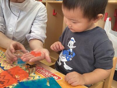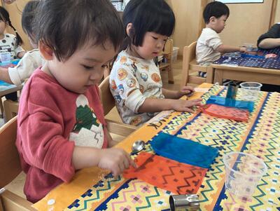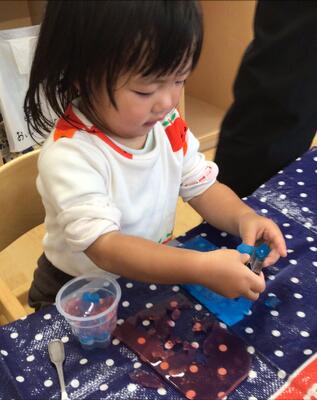 感触遊び後、“あかいろ”や“あおいろ”また絵本に出てきたフレーズの「カラスの色は、黒色!カーカー」の“カーカー”と言っている様子がちらほらみられましたヾ(≧▽≦)ノよく話を聞いて、子ども達ながらに学んでるんだなと歓心です!