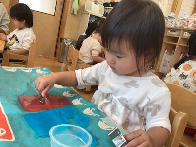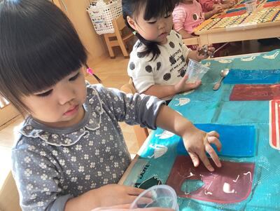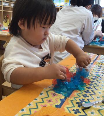 “つめたくて、ぷにぷにしてるね~”と声を掛けると、少し安心したのか各々好きなように触っていきました。型抜きに夢中な子がほとんどでした( *´艸`)
