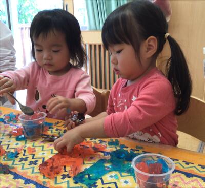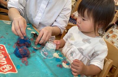 スプーンやゼリーカップを使って遊ぶ姿も!また“ぎゅぎゅー”と詰め込む姿も!!またそれを型抜くと、お山が現れました\(◎o◎)/!興味津々です。