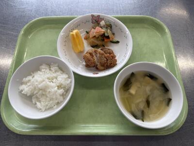 主菜の中華風ローストチキンは、生姜・にんにく・みりん・醤油・ごま油に、みじん切りにした玉葱を合わせて漬けて焼き上げました。玉葱が加わることでお肉がしっとりと仕上がり甘みもプラスしてくれます。給食室では生のにんにくと生姜を毎朝すり下ろして使っています。それによってお肉の旨味をギュッと引き出してくれるため本格的な味になります。子どもはもちろん大人もお美味しくいただきました!