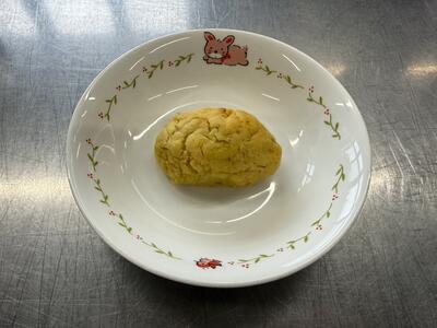 おやつは9月ということで「お月見」をイメージしたポテトもちでした。やさしい甘さのじゃがいもを蒸して潰し豆乳・片栗粉を混ぜて丸く成形しました。焼き上げたポテトもちに甘じょっぱいみたらしあんをかけるとまるで黄色い満月のような見た目に✨じゃがいもと片栗粉を使った生地は歯切れがよくもちもちとしながらも軽い食感に仕上がりました。じゃがいもはビタミンCや食物繊維が豊富で体にもうれしい食材です。子どもたちも「まんまる~!」「タレが甘くておいしい」と楽しそうに食べていました。