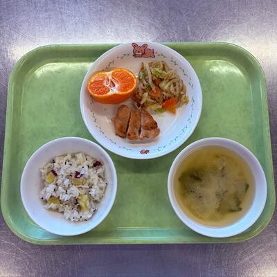 さつまいもごはん / 鶏肉の生姜焼き / ごまあえ / みそ汁 / みかん