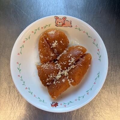 主菜の中華風ローストチキンは、生姜・にんにく・みりん・醤油・ごま油に、みじん切りにした玉葱を合わせて漬けて焼き上げました。玉葱が加わることでお肉がしっとりと仕上がり甘みもプラスしてくれます。給食室では生のにんにくと生姜を毎朝すり下ろして使っています。それによってお肉の旨味をギュッと引き出してくれるため本格的な味になります。子どもはもちろん大人もお美味しくいただきました!