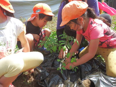 先生の話をよく聞いて、友達と協力しながら、畑に苗を植えました!