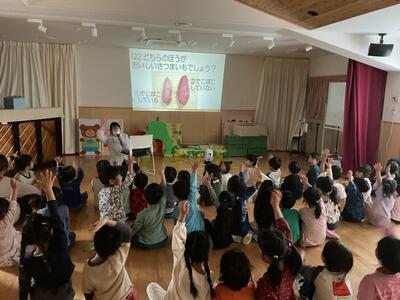 またおならが出るには、理由があること!おならを減らすには、皮ごと食べるといいこと!を伝えると、知らないことも多かったようで、先生と一緒に“へぇ~、そうなんだね!”と楽しく学んでいました(。-`ω-)