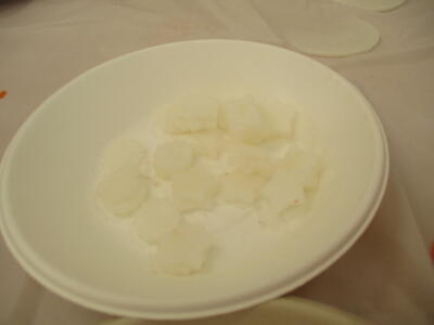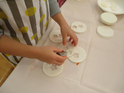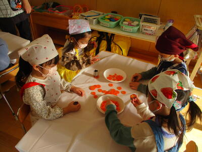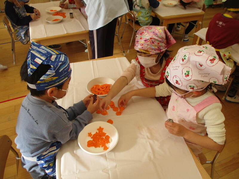 人参と大根を輪切りにし、同じテーブルのおともだちと交換しながら型抜きをしてもらいました。