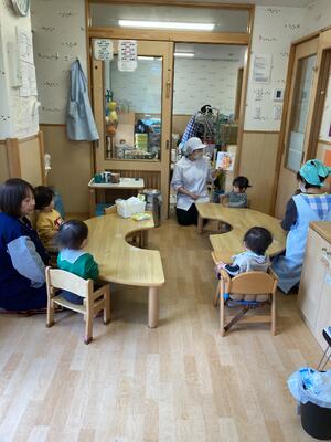 1月26日(月)にはな組で感触遊びを通してバナナジュース作りをしました( *´艸`)はじめに「ぐるぐるジュース」という絵本の読み聞かせをしました♪