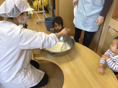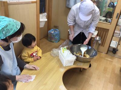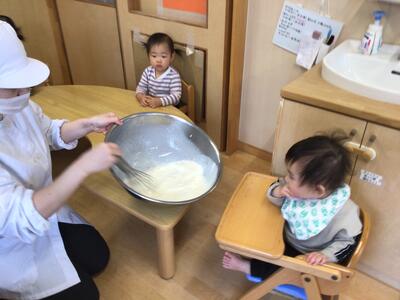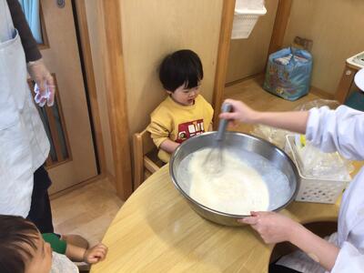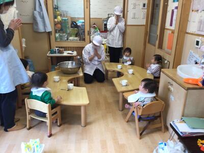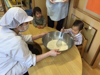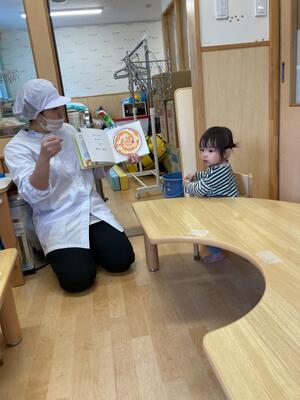 絵本の中で「ぜんぶいれたら まわしましょう! ◎ まわして まわして」「ぐるぐるぐるぐる…」というセリフがあるのですが、読み聞かせをしながらかき混ぜる姿をみせると、「ぐるぐる~」と一緒になってかき混ぜる姿が(*´▽`*)その一瞬一瞬の子ども達の姿が、とても可愛らしかったです♡