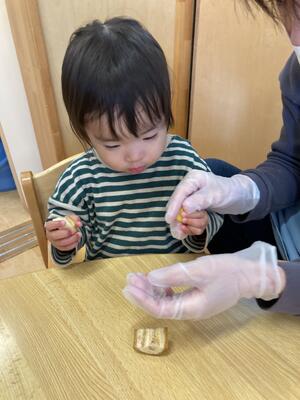 今年度最後の食育でしたが、みんな感触遊びを通して少しでも食材に興味を持ったり、好きになってくれていたら嬉しいです!来年度はまたお友達が増えて、やれること等も変わると思われます(。-`ω-)引き続き身近なことから「食育」を子ども達と一緒に行っていけたらと思います☆