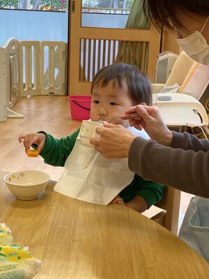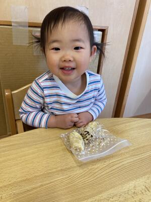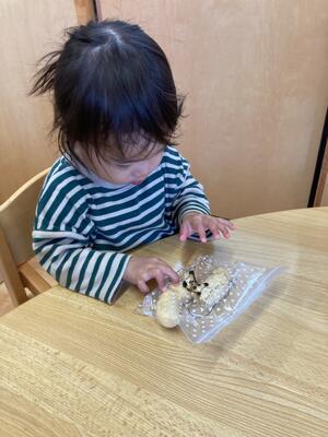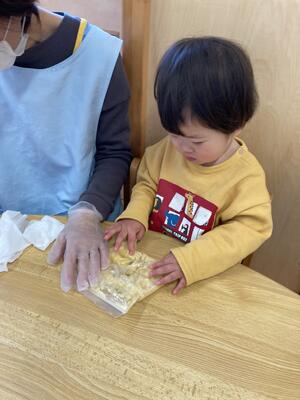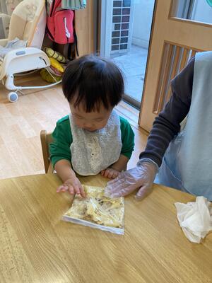 その後は一度手をキレイに拭き、袋越しにバナナをつぶしていきます!みんな上手に「えい!えい!」と手をパーやグー、又は指先で「ぷに!ぷに!」とつぶしていきます(∩´∀`)∩袋にパンダのイラストが描かれていたのですが、それを目掛けて「ぶちゅ!ぶちゅ!」と勢いよくつぶしていて、ボウルに移したときにはほぼつぶれている状態でした!