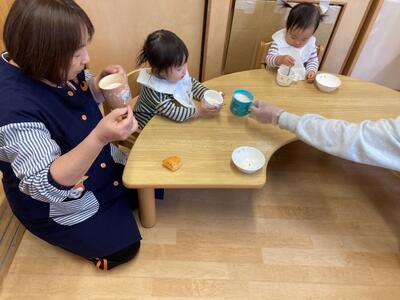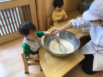 ボウルにみんながつぶしたバナナを入れたら、シロップと牛乳を順番に入れていきます!全部入れたら、みんなで少しずつ「ぐーるぐる!」といって、泡だて器で混ぜましたヾ(≧▽≦)ノみんなお口チャックで一生懸命混ぜてくれていました。混ぜ終わったら、コップに注いでみんなで「いただきます!」をして、おやつと一緒に食べ飲み始めました☆彡