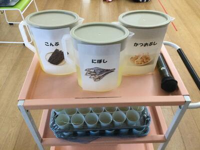 今回は厨房でかつお節、煮干し、昆布の3種類の出汁を取り実際に飲み比べをしてみました!今回はあえて塩や醤油などの調味料は加えずに出汁その物の味を味わってもらいました。どんな味がするんだろう?いつものすまし汁とみそ汁と同じような味かな?ドキドキでいざ試飲!