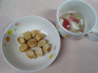 おやつはカラフルひな祭りゼリー、お麩のラスクでした。