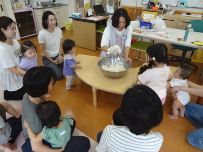 粉がまとまってきたら分けて、ママたちに仕上げこねをしてもらいました。