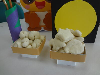 型抜きをしたり、ちぎったり、丸めたり…思う存分遊んだら、お団子を作ってサンポウに飾ります。