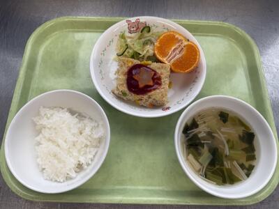 ごはん / クリスマスミートローフ / しゃきしゃき野菜サラダ / はるさめスープ / みかん