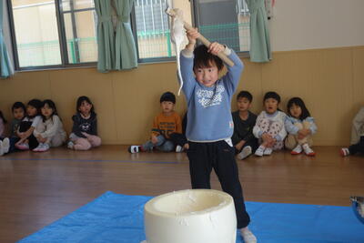 幼児クラスのお友達は、ホールで本物のもちごめを使っておもちつきをしました!