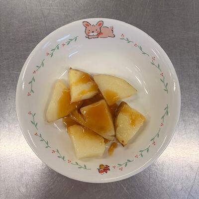 おやつは、秩父の郷土料理「みそポテト」でした。ホクホクに焼き揚げたじゃがいもに、甘辛い味噌ダレをからめた地元で昔から親しまれているおやつです。郷土料理は揚げたじゃがいもを串刺しにしますが、保育園ではいも全体に甘みそがからむようにして提供しています。
