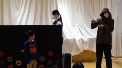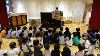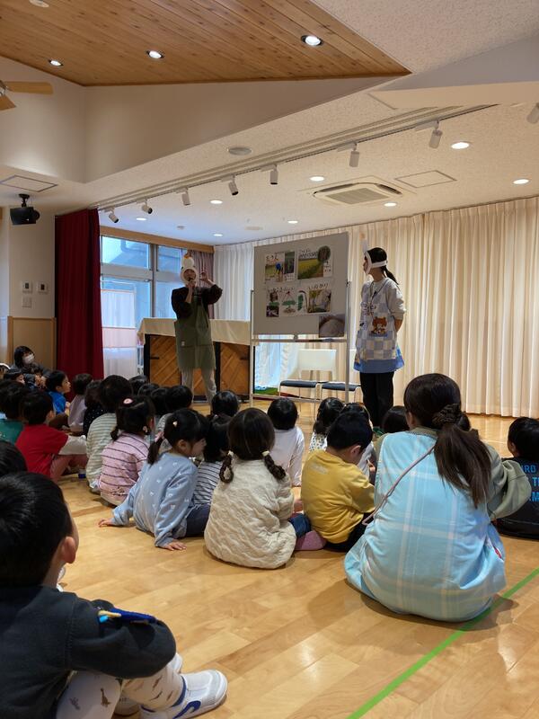 ここで特別ゲストの「先生のお友達のウサギさん」が来てくれて、一緒に「山の音楽家」のペープサートをしました。