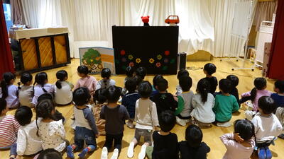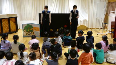 人形劇はカエルが出てくるお話で、お巡りさんはパトロールに行くので危ないことがあったらみんなが教えてあげてね。と言われて見入る子どもたち