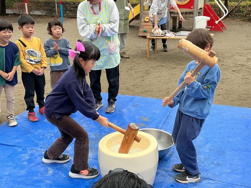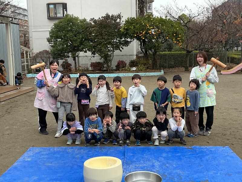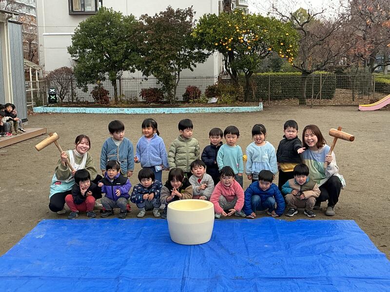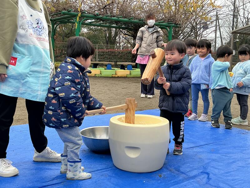 そら組は、「かるかったね!」と10回打った後にも余裕な表情しっかりと振り上げて、上手にお友だちと順番でお餅をついていました