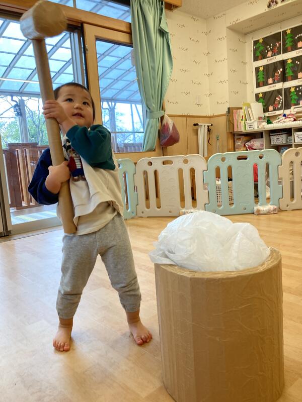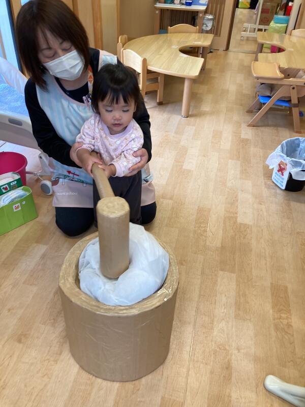 乳児クラスでもお部屋でおもちつき体験を楽しみました
