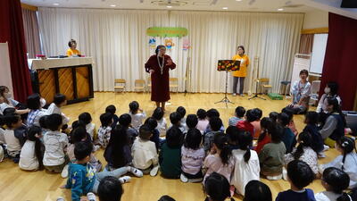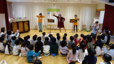 ここで特別ゲストの「先生のお友達のウサギさん」が来てくれて、一緒に「山の音楽家」のペープサートをしました。