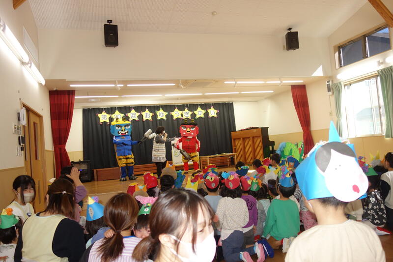 2月3日、すぎのこ保育園のホールでは各クラス節分のお面をかぶって全園児が集まってくれました。