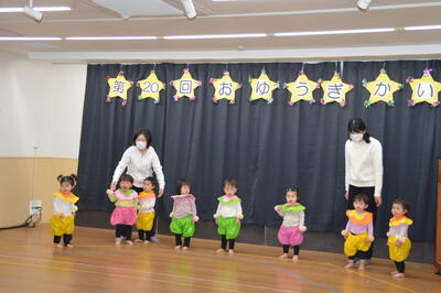 キラキラでカラフルな可愛らしい衣装を身に着けて登場。音楽が聞こえると笑顔が見られました。途中の寝そべってポーズの時の表情もとてもステキでした。保育士が手でトンネルを作るとくぐって行き、保護者の方に手を振る子もいましたね。楽しんで踊ることが出来ていました。