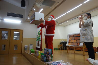 プレゼントを持って来てくれたサンタさんにみんなでありがとうをすると