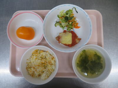 12月お誕生日会メニューは、ピラフ イタリアンチキン ブロッコリーサラダ 水菜スープ みかんでした。