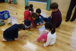 そして、お待ちかねの昔遊び!!部屋ごとに、「こま・けん玉」「おりがみ・お手玉」「かるた・おはじき」を各クラス順番に遊びました。