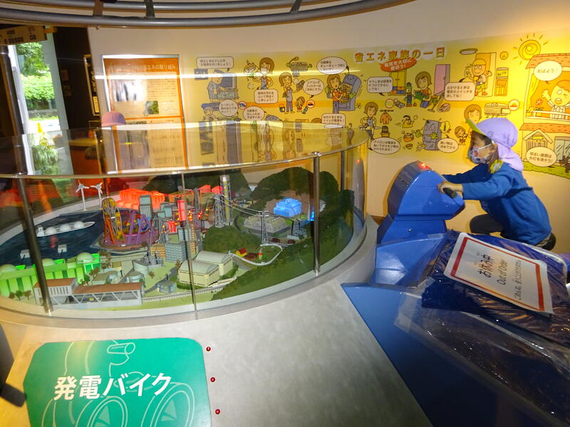 しくみの部屋ではバイクをこぐと模型の町の明かりが付く様子を見て、順番で